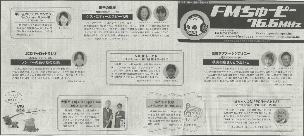 インターネット視聴可:FMちゅーピーのHPからその時間のみ。→https://chupea.fm/