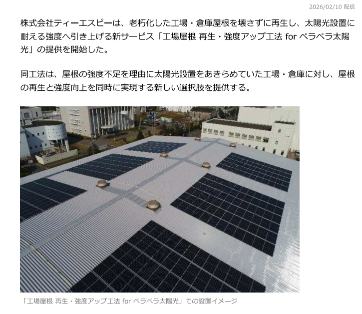 「工場屋根 再生・強度アップ工法 for ペラペラ太陽光」 が紹介されています。